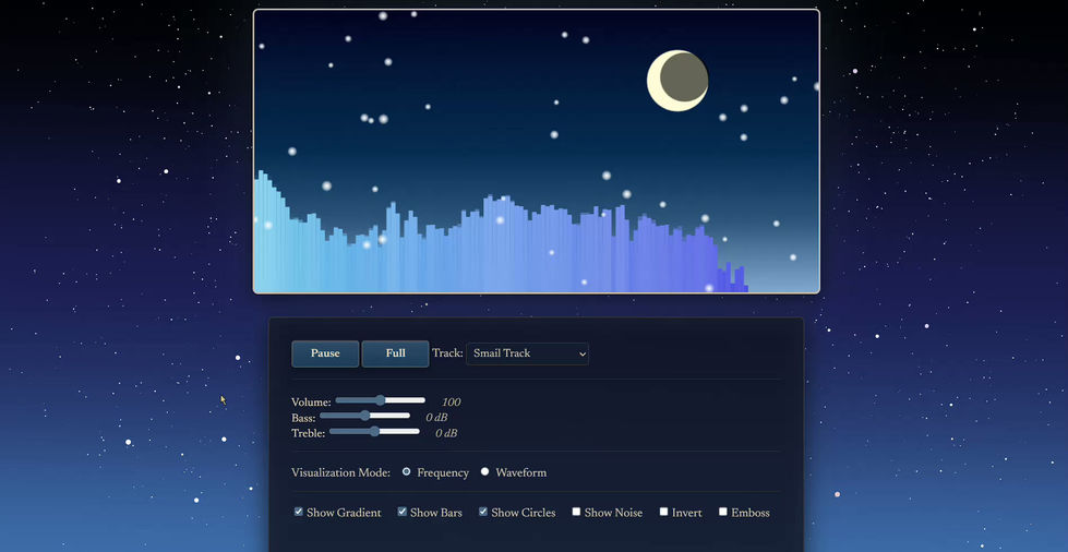 I created a web application audio visualizer using JavaScript and Canvas API. The website is not officially published due to copyright reasons for some of the music tracks used, but the one that can be heard in the video example is a short snippet of an original 2-minute track created by me.